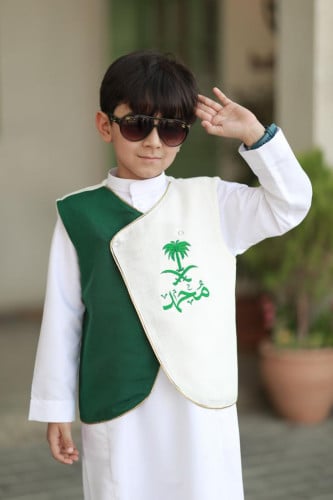 تم تصميم الفستان بشكل فريد يجمع بين الأصالة والحداثة، مما يجعله خيارًا مميزًا للاحتفال باليوم الوطني.