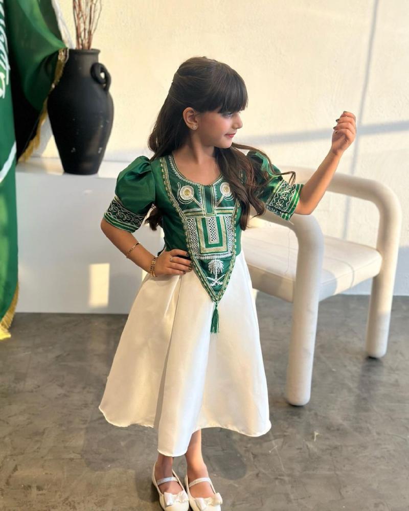 في المقابل، فستان يوم التأسيس الجنوبية يمتاز بتفاصيل مستوحاة من التراث المحلي، مظهره يعكس الأجواء الاحتفالية الخاصة باليوم الوطني.