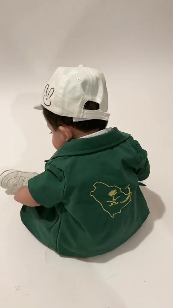 طقم الأطفال يحمل تصميم الهوية الوطنية، مع عبارة "المملكة العربية السعودية"، مما يجعله مناسبًا لهذه المناسبة الخاصة.