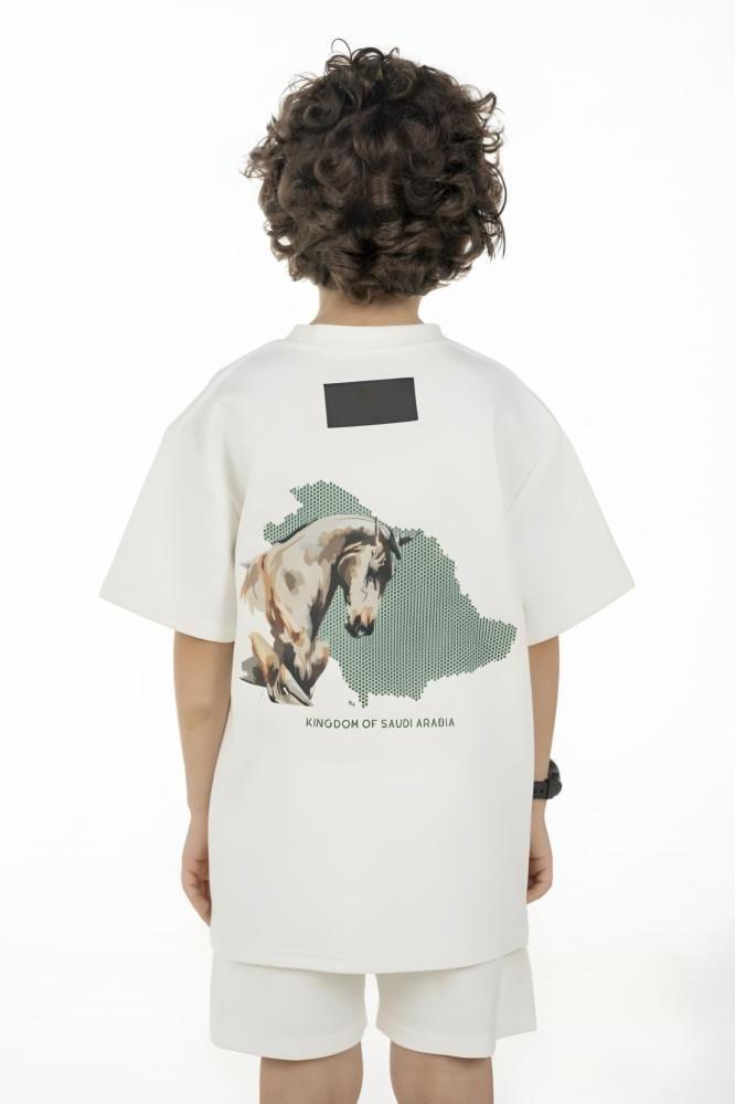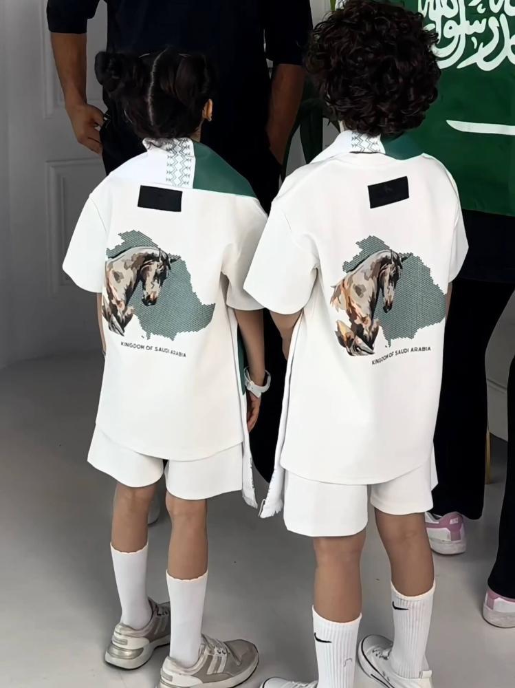 يتميز هذا الطقم بتصميم أنيق يتناسب مع روح الاحتفال باليوم الوطني، حيث يجمع بين تيشرت وشورت بتفاصيل عصرية.
