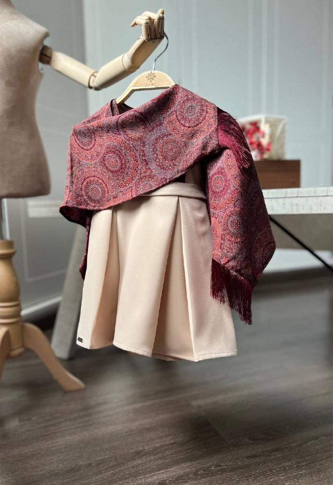 يترافق الفستان مع شال يتناغم تماماً مع تصميمه، مما يمنح مظهراً متكاملاً وأنيقاً يضمن راحة وأناقة في نفس الوقت.